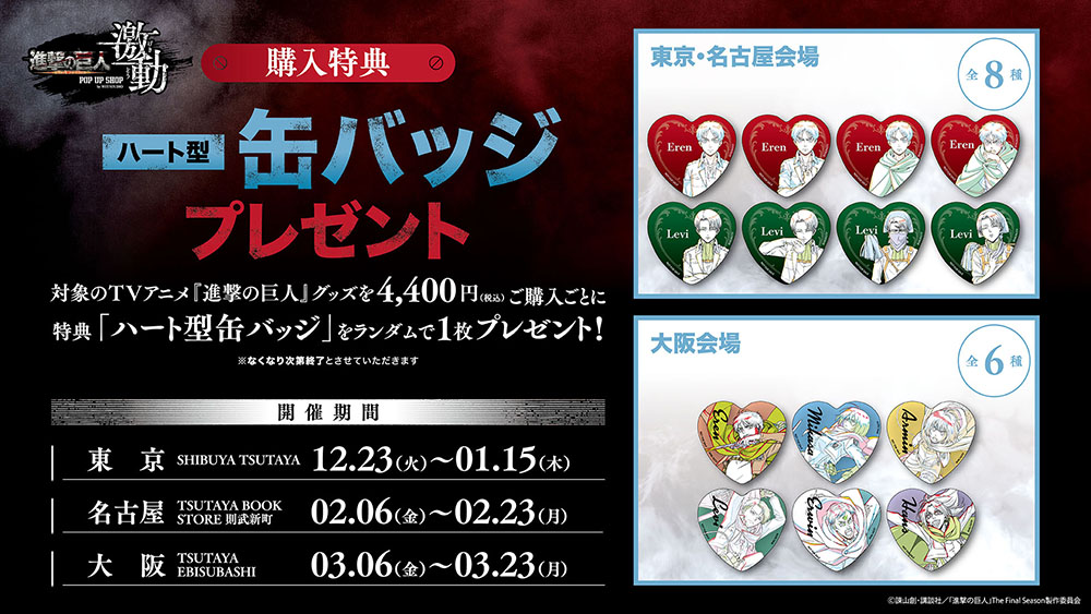 TV アニメ『進撃の巨人』対象商品を税込 4,400 円お買い上げごとに、特典「Animation ハート型缶バッジ(全8種)」をランダムで 1 つプレゼント!